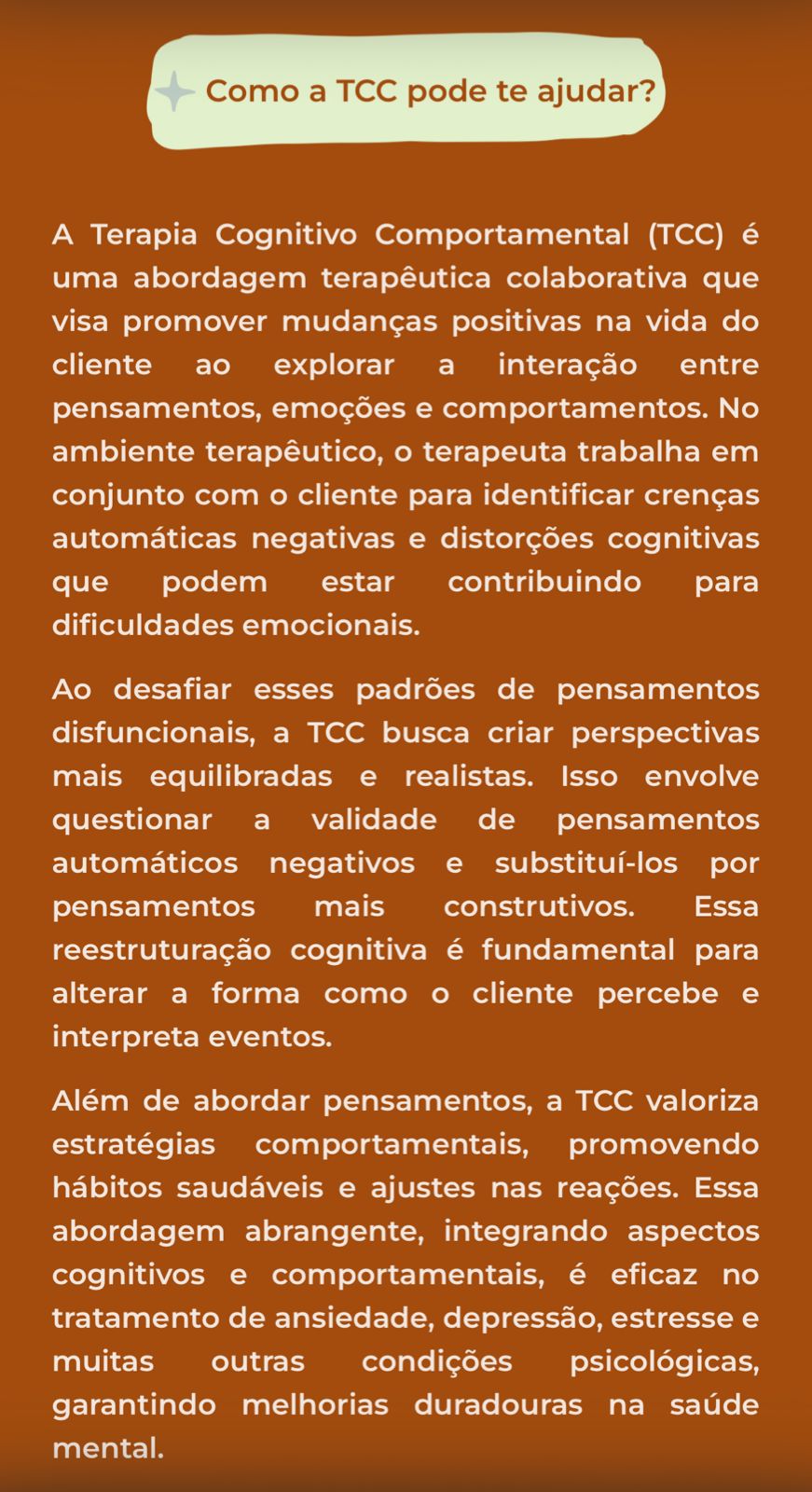 Sou psicóloga formada há 3 anos e dedico minha prática à clínica, atuando com adolescentes e adultos em seus processos de desenvolvimento emocional. Minha trajetória é marcada por uma escuta acolhedora, respeito à singularidade e compromisso em oferecer um espaço seguro para que cada pessoa possa compreender suas experiências, reconhecer seus recursos internos e construir novas possibilidades. Atualmente, curso pós-graduação em Terapia Cognitivo-Comportamental (TCC), abordagem que utiliza estratégias estruturadas e baseadas em evidências para auxiliar na identificação de padrões de pensamento e comportamento que influenciam o bem-estar. Meu objetivo é promover autoconhecimento, fortalecer habilidades emocionais e apoiar mudanças significativas na vida dos pacientes, sempre com ética, sensibilidade e cuidado. Trabalhar com pessoas é a minha motivação diária, e acredito no potencial transformador de um processo terapêutico construído com confiança e acolhimento.